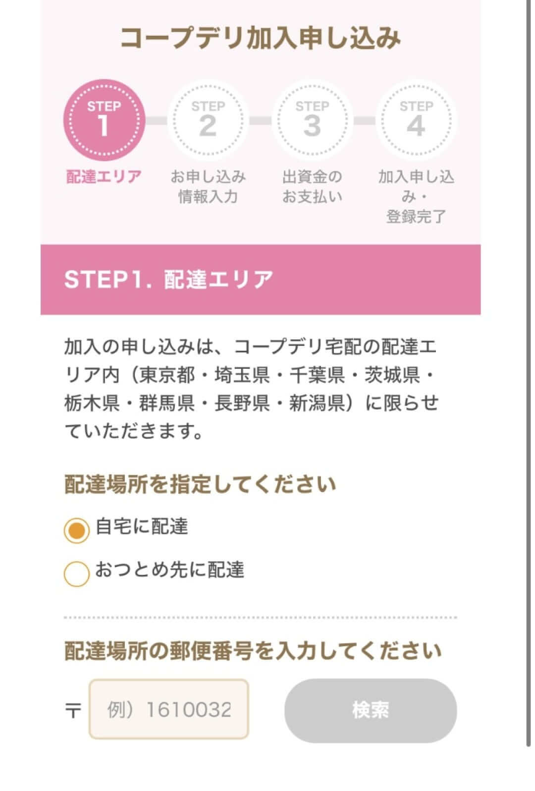 まず、配達エリア選択のため配達場所を指定し、郵便番号を入力して「検索」ボタンを押します。