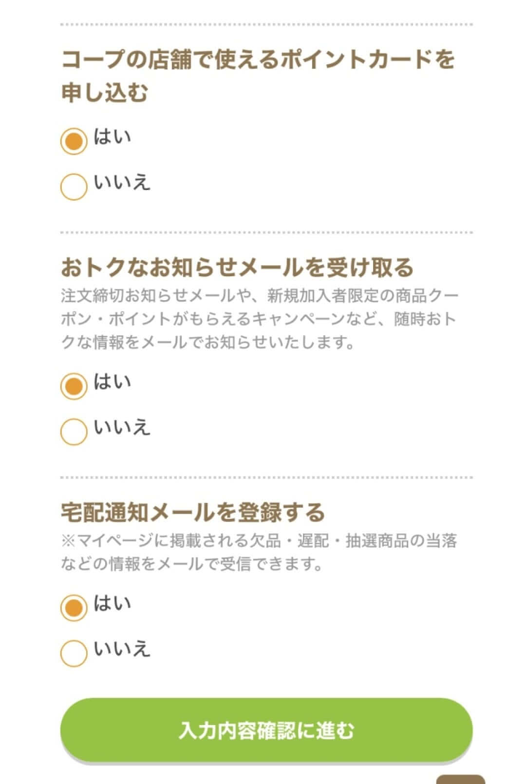 その他、ポイントカードやメール通知設定などを選択し、「入力内容確認」に進みます。